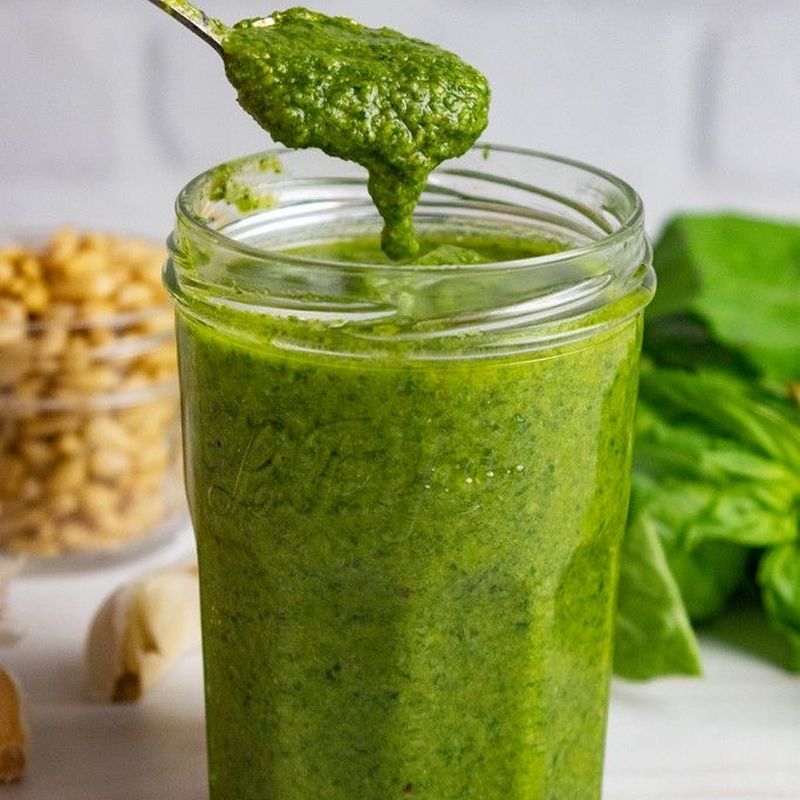 Состав: листья базилика, оливковое масло, лимонный сок, кедровые орешки, кешью, пищевые дрожжи Nutritional yeast, соль морская, черный перец, чеснок.