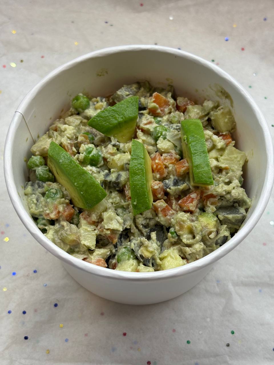 авокадо, пастернак, зелёный горошек, морковь, маринованные огурцы, кокосовая моцарелла, кешьюнез.